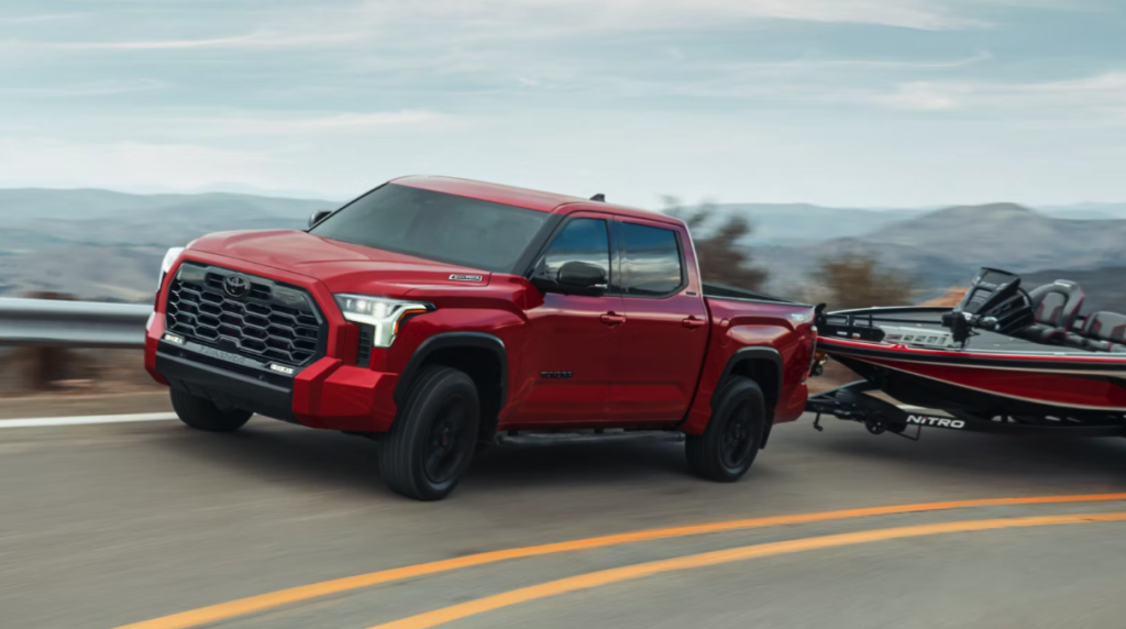 The Tundra is great for weekend boat trips or daily work hauling. It has features like Multi-Terrain Select and Tow/Haul Mode for a smooth ride. Its power, tech, and Toyota’s reliability make towing a breeze.