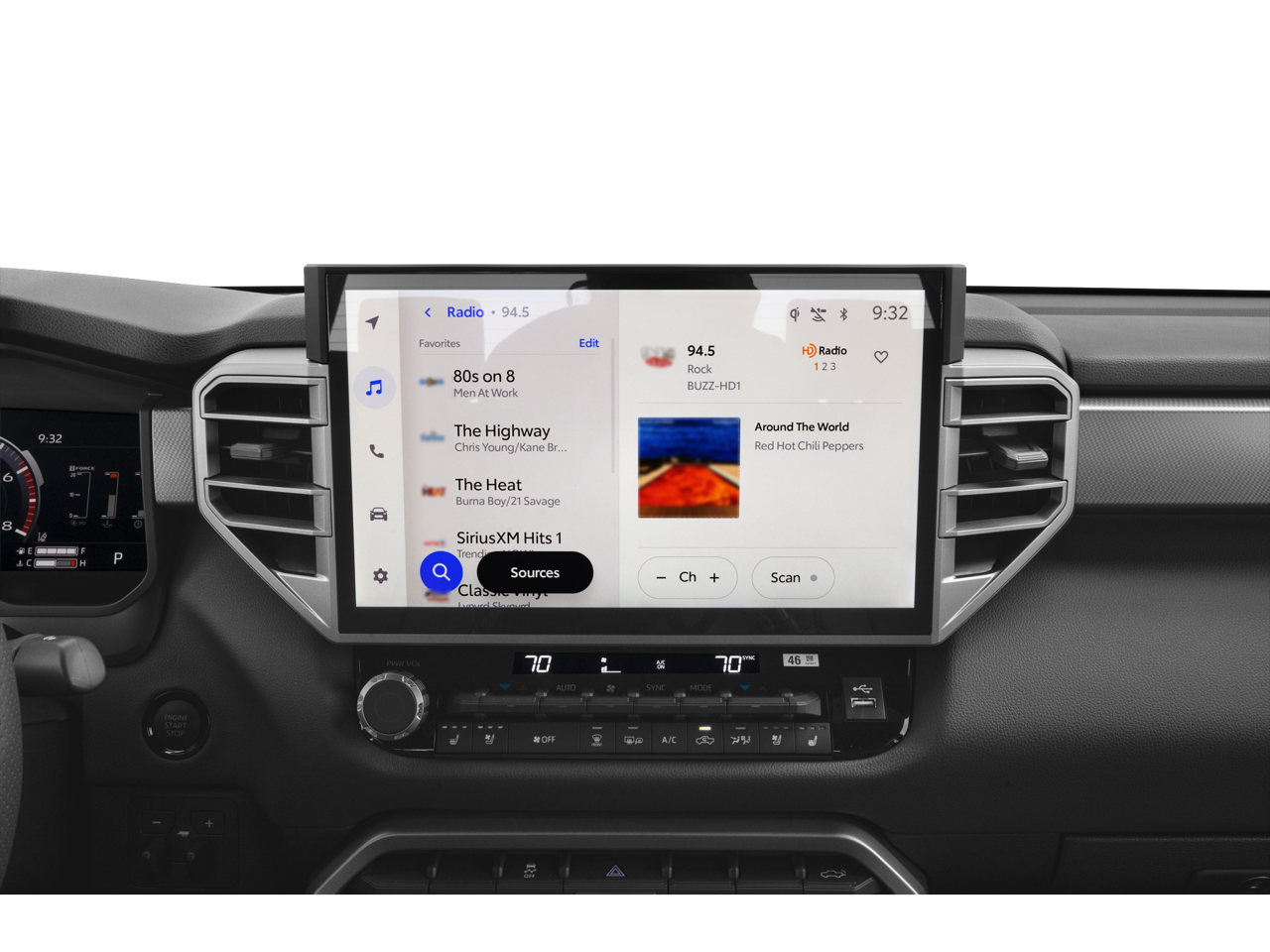 • Radio: Audio Plus -inc: 14-inch touchscreen, 9 speakers, Android Auto and Apple CarPlay compatible and SiriusXM w/3-month platinum plan trial subscription, See toyota.com/audio-multimedia for details, Connected services - Safety Connect w/up to 10-year trial, Remote Connect w/1-year trial, Drive Connect w/1-year trial, Service Connect w/up to 10-year trial, Wi-Fi Connect w/up to 3 GB within 1-month trial, See toyota.com/connected-services for details